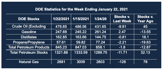 Supply/demand data in the United States for the week ended January 22, 2021, were released by the Energy Information Administration.