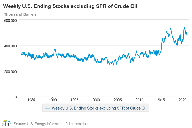 Last week EIA said that stocks of commercial crude oil (excluding oil in the Strategic Petroleum Reserve) were 476.7 million barrels. This represented 10 million fewer barrels in storage than during the previous week. This was a substantial drop in supplies in a market that showed demand essentially flat from the prior week.