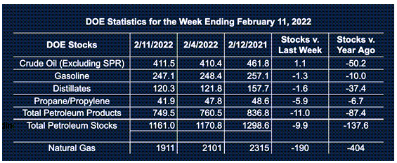 Supply/demand data in the United States for the week ended Feb.11, 2022, were released by the Energy Information Administration.