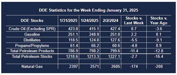Supply/demand data in the United States for the week ended January 31, 2025, were released by the Energy Information Administration.