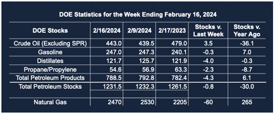 Supply/demand data in the United States for the week ended February 16, 2024, were released by the Energy Information Administration.