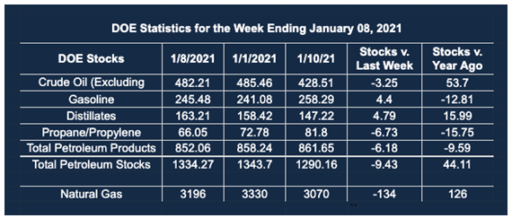 Supply/demand data in the United States for the week ended January 8, 2021, were released by the Energy Information Administration.
