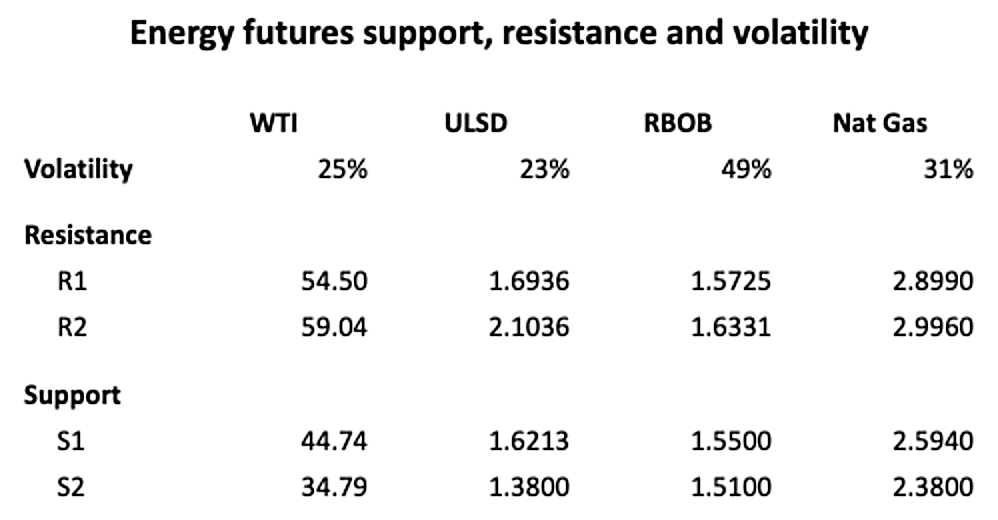 Price patterns have been similar for ULSD and RBOB. Prices are experiencing slow advances with very small corrections. This has the effect of reducing volatility. Lower volatility produces narrower price bands and the possibility of greater price ranges once they break support or resistance.