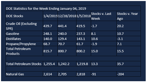 Supply/demand data in the United States for the week ending January 04, 2019 were released by the Energy Information Administration.