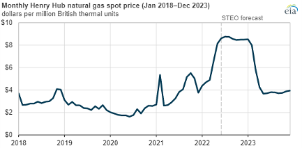 The Department of Energy expects that natural gas prices at Henry Hub could average $4.90 for 2023. DOE forecasts prices for 2024 to move even lower, averaging $4.80 next year. The 2023 forecast is a 9.8% cut in price from 2022. It reflects falling U.S. demand and relatively flat LNG exports. The weakness continuing into 2024 contemplates dry natural gas production growing more rapidly than LNG exports from expanded LNG export capacity.
