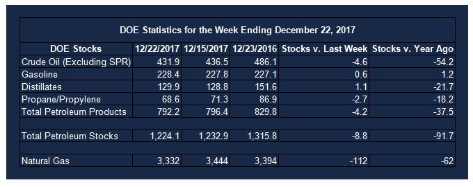 Supply/demand data in the United States for the week ending December 22, 2017 were released by the Energy Information Administration.