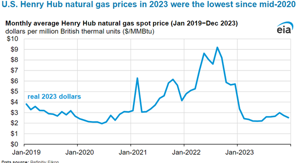 EIA reports the average Henry Hub price was below $3.00 per MMBtu in every month save January. The lowest price was the May average at $2.19 per MMBtu. Production of natural gas outpaced demand. EIA estimated U.S. dry natural gas output averaged 104 Bcf/d in 2023. This was about 4 percent more than in 2022.