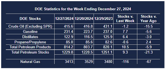 Supply/demand data in the United States for the week ended December 27, 2024, were released by the Energy Information Administration.