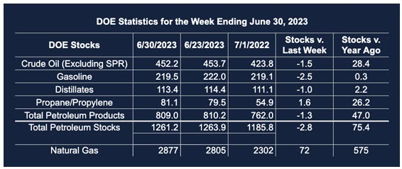 Supply/demand data in the United States for the week ended June 30, 2023, were released by the Energy Information Administration.
