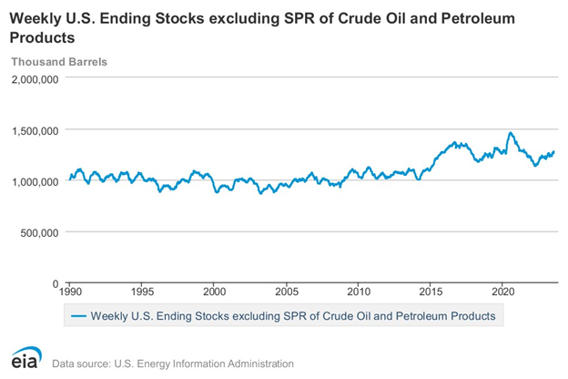 Total commercial stocks of petroleum rose (⬆) 17.0 million barrels to 1.2781 billion barrels during the week ended July 7, 2023.