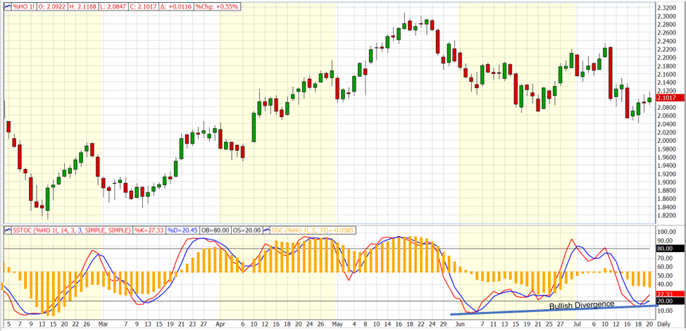 When the fundamentals are at odds, technical analysis might allow us to get a better handle on the outlook for price. RBOB futures have held $2.00 support. The ULSD continuation charts are showing bullish divergence. Prices topped in May around $2.28. Prices sold off until mid-June, bottoming just below $2.07. After a rally, prices again moved lower in July, making a new low for the move. Technical indicators measuring the momentum of the selling did not register a new low, despite the price action. Bullish divergence can signal that the bears are running out steam and the market is getting ready to turn.