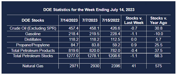 Supply/demand data in the United States for the week ended July 14, 2023, were released by the Energy Information Administration.