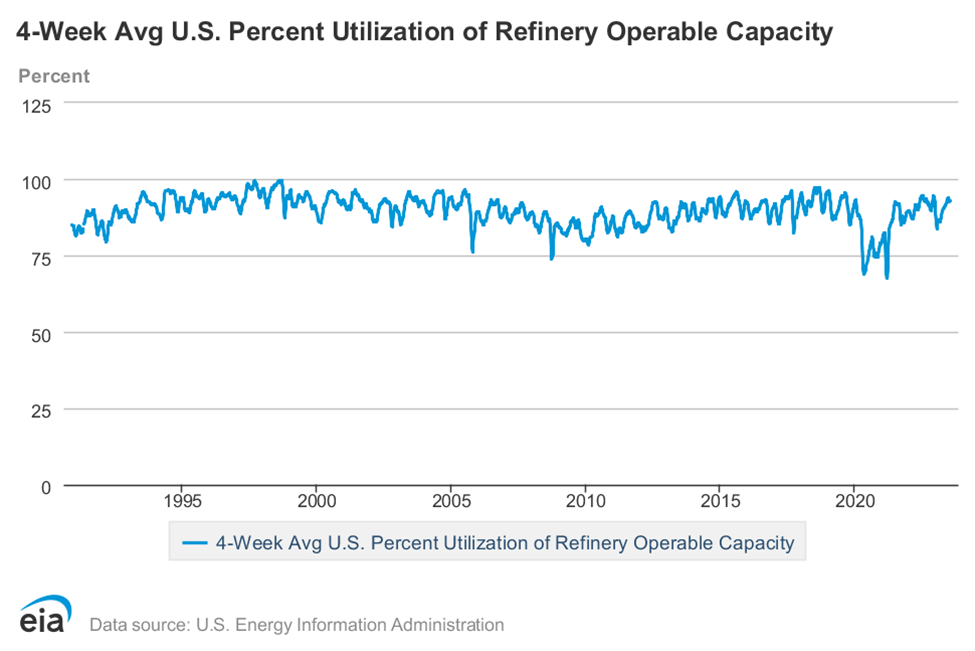 Little relief has come from refineries, where facilities ran at 94.3% of capacity in last week’s report. American refineries have been operating in excess of 90% of capacity since August 2021.
