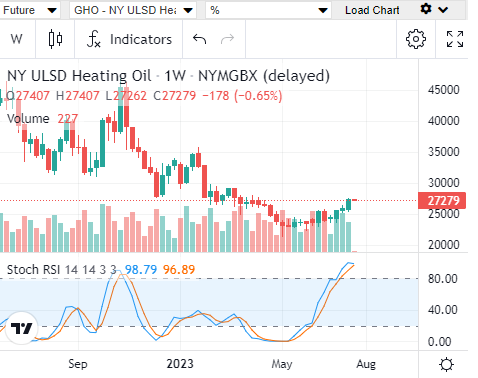 One caution should be noted for those seeking a bullish entry point. Both product technical charts are strong, but both have had steady advances within the past few weeks. Technical traders know that markets advance in a wave pattern. And the advances we have seen have had little respite. The chart for ULSD in particular, is overbought, and one of the measures of overbought, the Stochastic, appears ready for a cross, suggesting a retreat.