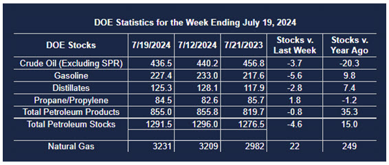 Supply/demand data in the United States for the week ended July 19, 2024, were released by the Energy Information Administration.