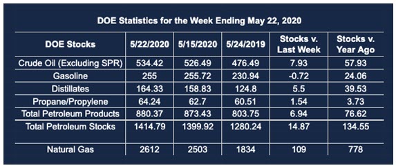 Supply/demand data in the United States for the week ending May 22, 2020, were released by the Energy Information Administration.