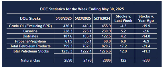 Supply/demand data in the United States for the week ending May 30, 2025, were released by the Energy Information Administration.