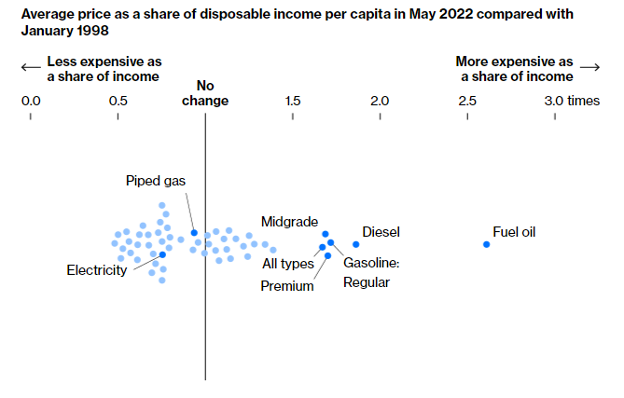The chart below, from US government sources, shows gasoline and fuel oil are taking a larger share of disposable income now versus January 1998. Matrix