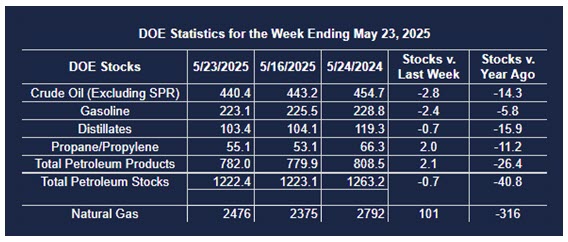 Supply/demand data in the United States for the week ended May 23, 2025, were released by the Energy Information Administration.