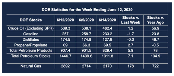 Supply/demand data in the United States for the week ended June 12, 2020, were released by the Energy Information Administration.