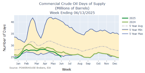 Moderating supply taken in conjunction with high levels of refinery throughput have driven crude oil days of supply below the low of the current five year range.