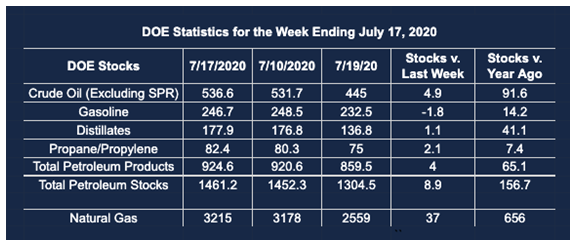 Supply/demand data in the United States for the week ended July 17, 2020, were released by the Energy Information Administration.