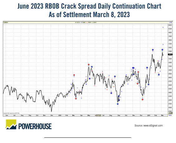 This has not happened yet. Spot RBOB futures reached $2.81 early last week, but settled on Friday at $2.65 per gallon. And RBOB futures continue to make new lows. At writing, RBOB futures have moved below $2.5650.