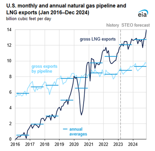 The action in natural gas markets continues to focus on exports of liquefied natural gas (LNG.) Growth in LNG exports has been impressive. Starting in 2016, exports reached 10.6 Bcf/d last year. EIA projects outflow of 12.1 Bcf/d in 2023, (+14%,) and 0.7 more Bcf/d in 2024 (+5%.)