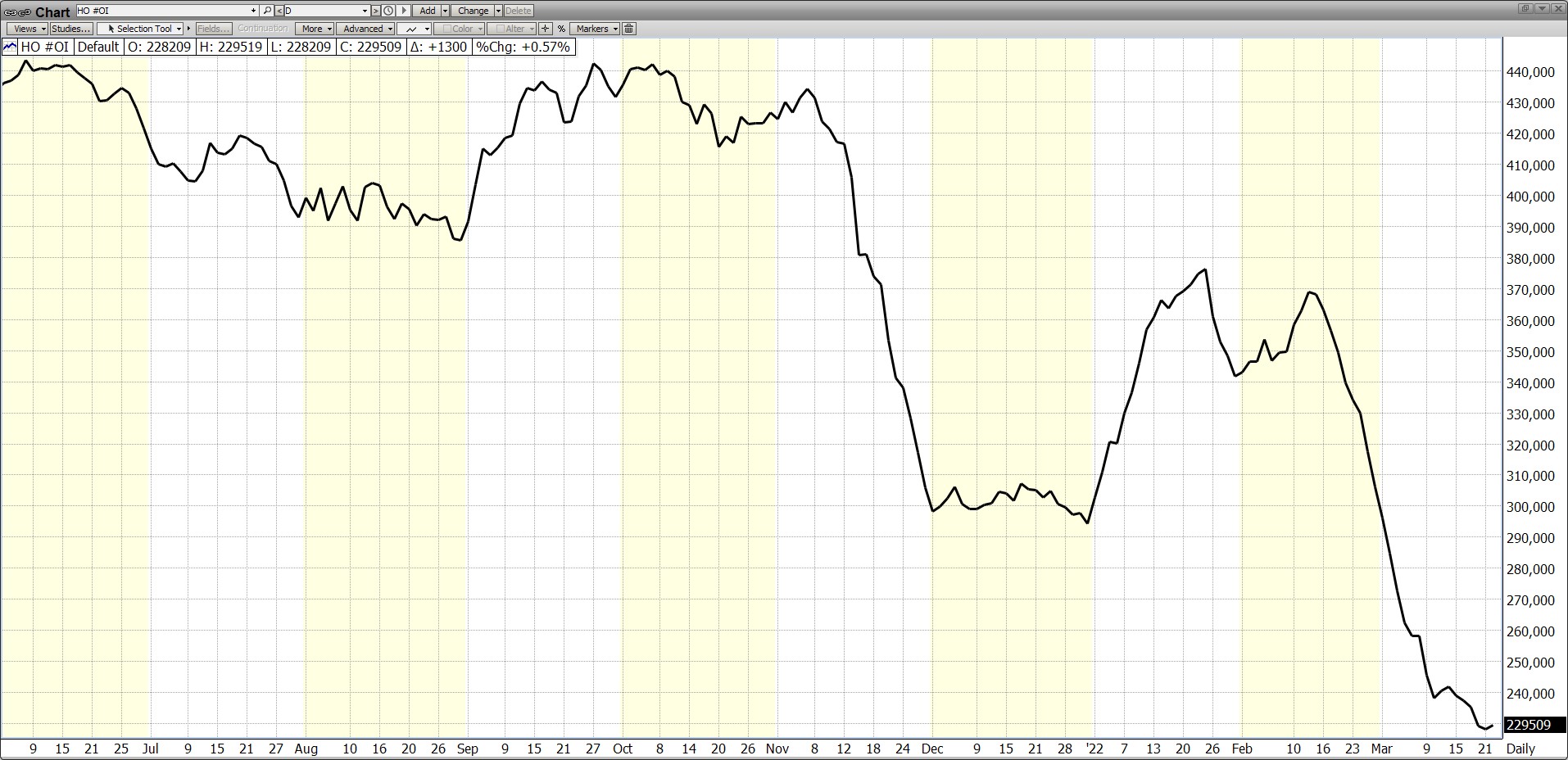 Between February 15 and March 16, the ULSD futures market has seen truly historic price action. The biggest one day move up AND down in price as well as an all-time high intraday price. Focusing only on the closing prices from the start to the end of that period, the market rose approximately 24 cents/gallon. Rising price with dramatically falling open interest. Omens of a weakening trend?