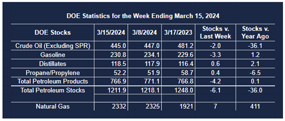 Supply/demand data in the United States for the week ended March 15, 2024, were released by the Energy Information Administration.