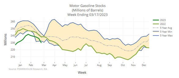 A bullish inventory report for the week ending March 17, 2023, was not enough to ignite the spring gasoline rally that is usually, by now, well underway. Petroleum supplies lost 10.4 million barrels during the week, with reductions in inventories of motor gasoline and distillate fuel oil of 6.4 and 3.3 million barrels respectively. (Propane stocks fell too, some 2.3 million barrels.)