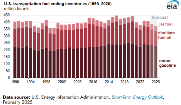 However, less gasoline output from refineries will be largely offset by improved fuel efficiency and less employment growth. EIA forecasts that gasoline demand will remain unchanged in 2025 but decline by approximately 1% in 2026.