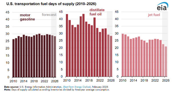 The EIA believes jet fuel will face the tightest supply & demand conditions of the three major transportation fuels. U.S. jet fuel consumption is expected to reach all-time highs in 2026, and days of supply may reach levels not seen since 1963.