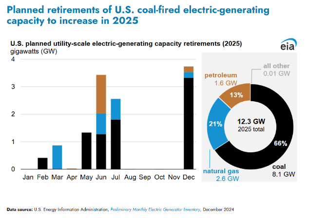 A more familiar source of increased natural gas demand is set to increase in 2025. The EIA forecasts that planned retirements of coal and oil-fired powerplants is set to increase in 2025. Electricity generators plan to retire 12.3 gigawatts of capacity in 2025, a 65% increase over 2024. Coal-fired power plants account for two thirds of this total.