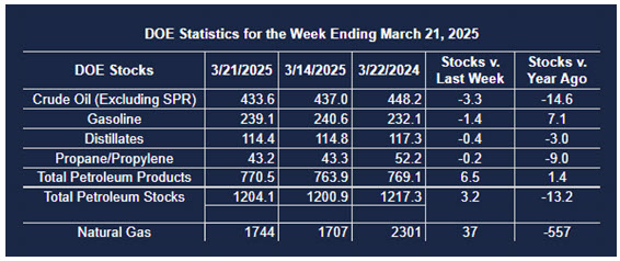 Supply/demand data in the United States for the week ended March 21, 2025, were released by the Energy Information Administration.