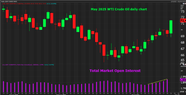WTI crude futures have been rallying on rising open interest. This tells us that the new money coming into the market is influenced by buyers who are motivated to cross the bid-ask spread to lift offers. An important note for those monitoring open interest themselves, it’s critical to consider total market open interest, that is open interest for all contract months for a particular commodity, not just the front month.