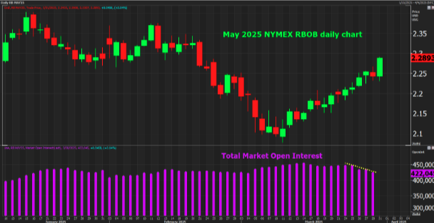 The open interest statistics for refined products show a markedly different behavior. The last edition of The Weekly Energy Market Situation highlighted falling open interest in diesel futures. The chart below shows RBOB gasoline futures now following suit. Total market open interest for RBOB futures has fallen 4.97% over the last four trading days.