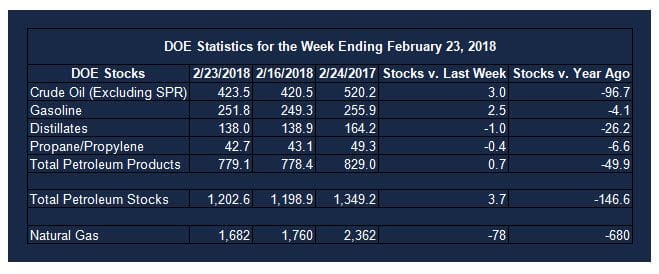 Total commercial stocks of petroleum rose 3.7 million barrels during the week ending February 23, 2018.