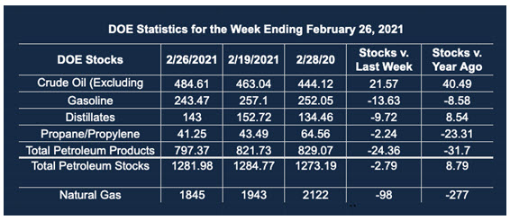 The weekly EIA supply/demand report for the week ended February 26, 2021, booked a gain of 21.6 million barrels of crude oil in storage. Additional stocks and a recovery in domestic crude oil production are both bearish for price. Nonetheless, energy spot futures are continuing to make new highs. April ULSD ended last week at $1.944. RBOB ended the week at $2.0647. WTI April crude oil futures ended the week at $66.09.