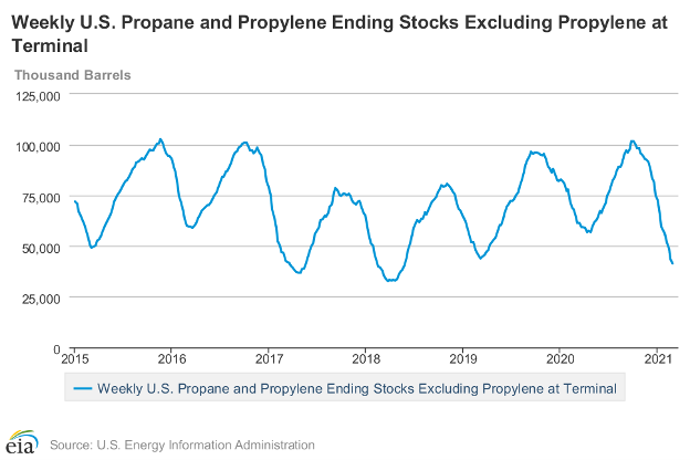 Propane stocks decreased 2.2 million barrels from the previous report week; propane stocks are 41.2 million barrels. The report estimated current demand at 1.487 million barrels per day, an increase of 536,000 barrels daily from the previous report week.
