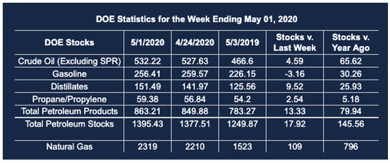 Supply/demand data in the United States for the week ending May 1, 2020, were released by the Energy Information Administration.