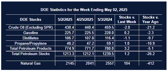 Supply/demand data in the United States for the week ended May 2, 2025, were released by the Energy Information Administration.