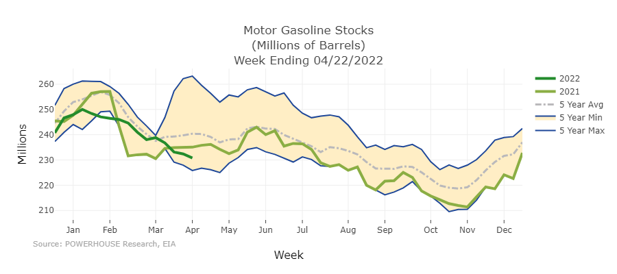 Supply/demand data in the United States for the week ended April 22, 2022, were released by the Energy Information Administration.