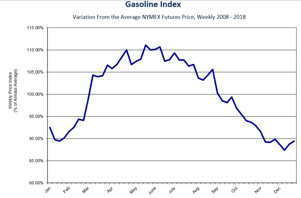 The apparent top in RBOB prices should not come as a surprise. Powerhouse has measured typical pricing in gasoline. The resulting Gasoline Index shows the high average price occurring early in May. Subsequent months experience a generally weakening pattern.