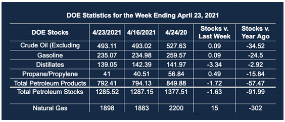 Supply/demand data in the United States for the week ended April 23, 2021, were released by the Energy Information Administration.