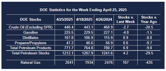 Supply/demand data in the United States for the week ending April 25, 2025, were released by the Energy Information Administration.