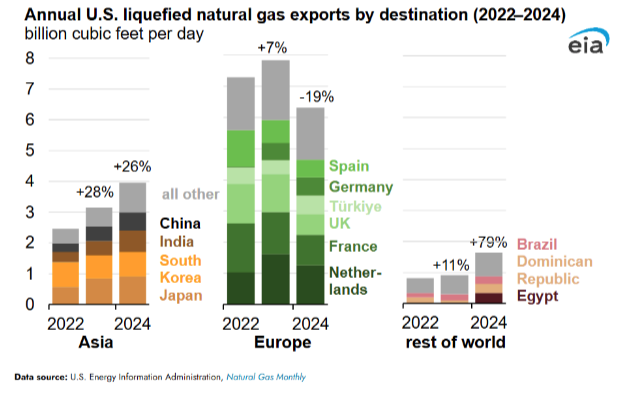 The EIA also commented recently on U.S. LNG exports. They forecast a 4% growth in growth demand in 2025 with an 18% increase in LNG exports. This amount outpaces the expected 9% increase in residential and commercial sectors.