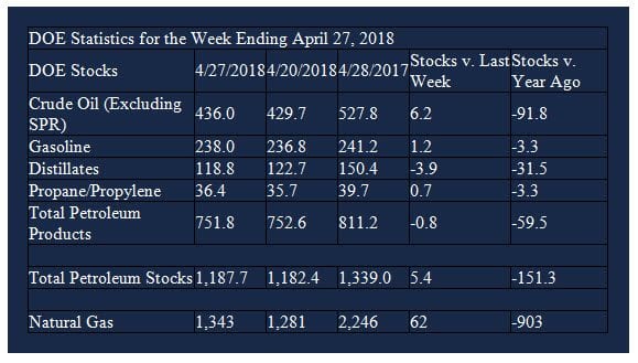 Supply/demand data in the United States for the week ending April 27, 2018 were released by the Energy Information Administration.