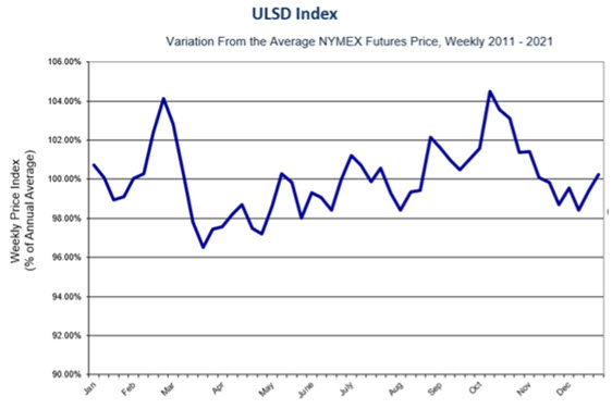 The ULSD Price Index shown below reminds traders that the pre-winter price low is upon us. If history prevails, markets may anticipate prices bottoming around this time. Distillate shortfalls have been documented here by Powerhouse several times in recent Weekly Energy Market Situation reports. And gasoline, with supplies at a low, will start rebuilding stocks in expectation of the spring and a renewed driving season.
