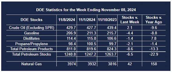 Supply/demand data in the United States for the week ended November 8, 2024, were released by the Energy Information Administration.